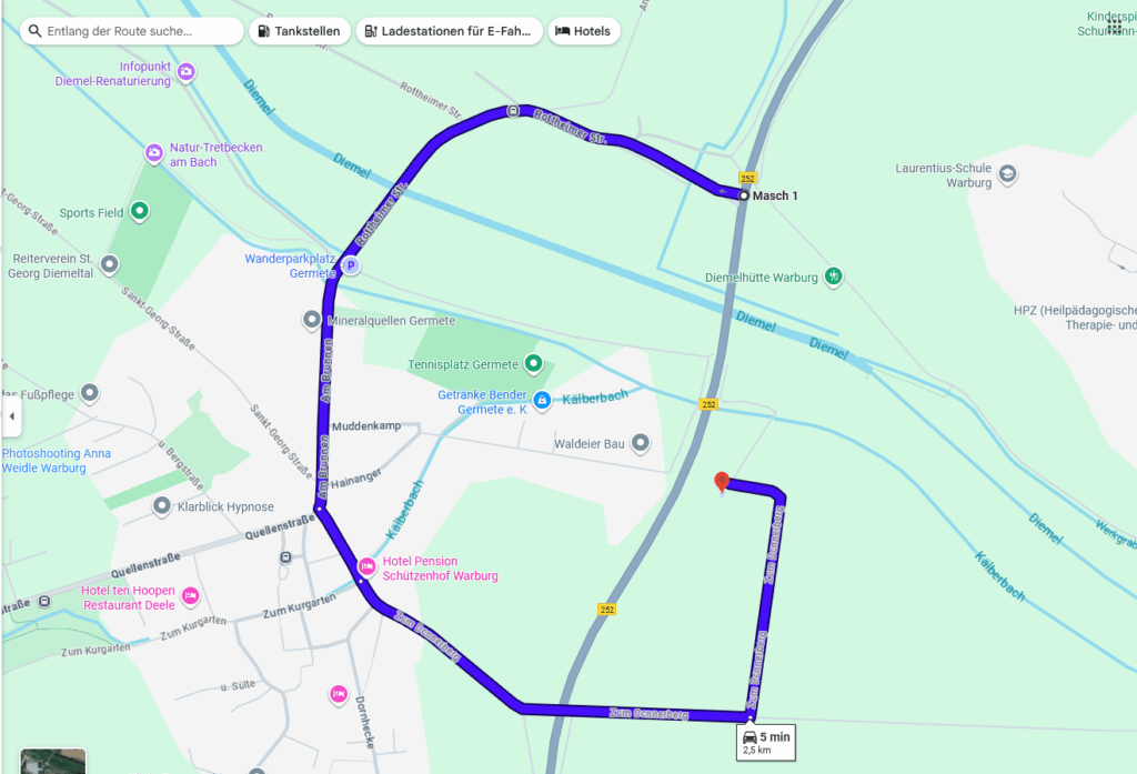 Biegen Sie von der B252 Richtung Germete ab und folgen der Rottheimer Straße. Diese geht in Am Brunnen über. Halten Sie sich links und fahren Sie geradeaus auf Zum Donnerberg. Nach 700 m biegen Sie noch einmal links ab – Sie bleiben auf Zum Donnerberg.
